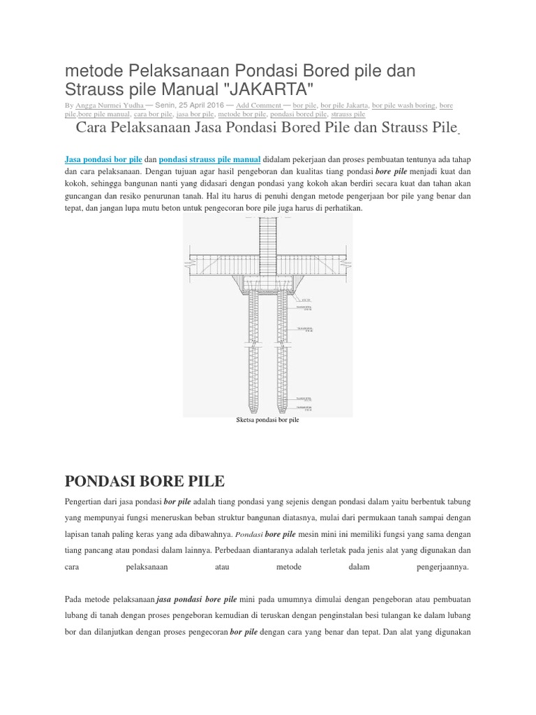 Metode Pelaksanaan Pekerjaan Pondasi Bore Pile from 2.bp.blogspot.com Pondasi bore pile adalah jenis pondasi dalam yang berbentuk tabung, yaitu berfungsi meneruskan beban struktur bangunan diatasnya dari permukaan tanah sampai lapisan tanah keras di bawahnya.pondasi bore pile memiliki fungsi yang sama dengan pondasi tiang pancang atau pondasi dalam lainya. Beberapa jenis alat dan metode pengerjaan bor pile. Ratumbuysang karena pekerjaan pondasi merupakan komponen yang penting di dalam struktur Yang dibawah ini akan saya jelaskan secara rinci tahap pekerjaan jasa strauss pile.tetapi sebelum masuk ke tahap pekerjaan strouss pile, tidak ada salahnya kita mengingat dan mengetahui apa itu yang di maksud dengan pekerjaan strauss pile. Dengan tujuan agar hasil pengeboran dan kualitas tiang pondasi bore pile menjadi kuat dan kokoh, sehingga bangunan yang nantinya didasari dengan pondasi yang kokoh akan berdiri secara kuat dan tahan akan guncangan dan. Pondasi bore pile hampir sama dengan strauss pile yang membedakan adalah dalam pelaksaannya, pondasi bore pile dikerjakan dengan mesin alat mini crane dengan alat ini dapat dikerjakan pondasi dengan diameter 30cm , 40cm , 50cm dan 60cm kedalaman pondasi mencapai 30 meter, metode bore pile alat mini crane sering digunakan untuk bangunan di daerah padat penduduk. Untuk memahami bagaimana cara kerja hadi jaya bore land dalam pekerjaan bore pile, maka dibuatlah metode pelaksanaan yang dapat dipahami oleh pihak terkait. Bor pile manual adalah kata lain dari pondasi strauss pile yang mempunyai pengertian jenis pondasi dangkal yang cara pelaksanaan atau metode kerja strauss pile dengan cara pengeboran secara manual dan dikerjakan oleh tenaga manusia menggunakan alat bor yang sederhana.